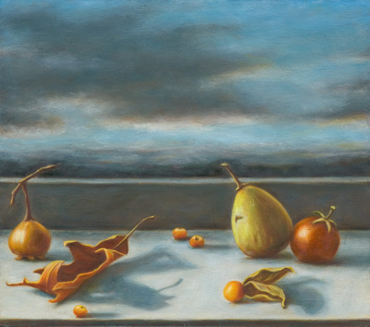 In these paintings, Kraut takes liberties with the "reality" of the scene, inventing still life arrangements and compositions that may not have ever existed. Yet, through her observation and understanding of how light interacts with the physical objects before her, and her mastery in rendering the phenomena, Kraut slows down time for the viewer, and creates a palpable sense of place. Says Kraut" I carried the quinces, figs and berries that I had found on a recent trip through Provence, back to England, piled them on the windowsills of my second-floor flat; I added to them the leaves, berries and pods I found on my walks through Oxford. Of course, the fruit began to rot and shrivel, and the leaves began to dry and curl. The paintings became in part a document of their decay, a perfect complement to the swiftness of the changes in the skies and seasons.