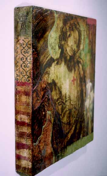 Comfort and Confess - side view 2001 oil, wax, tar, collage on wood 25"x 32"