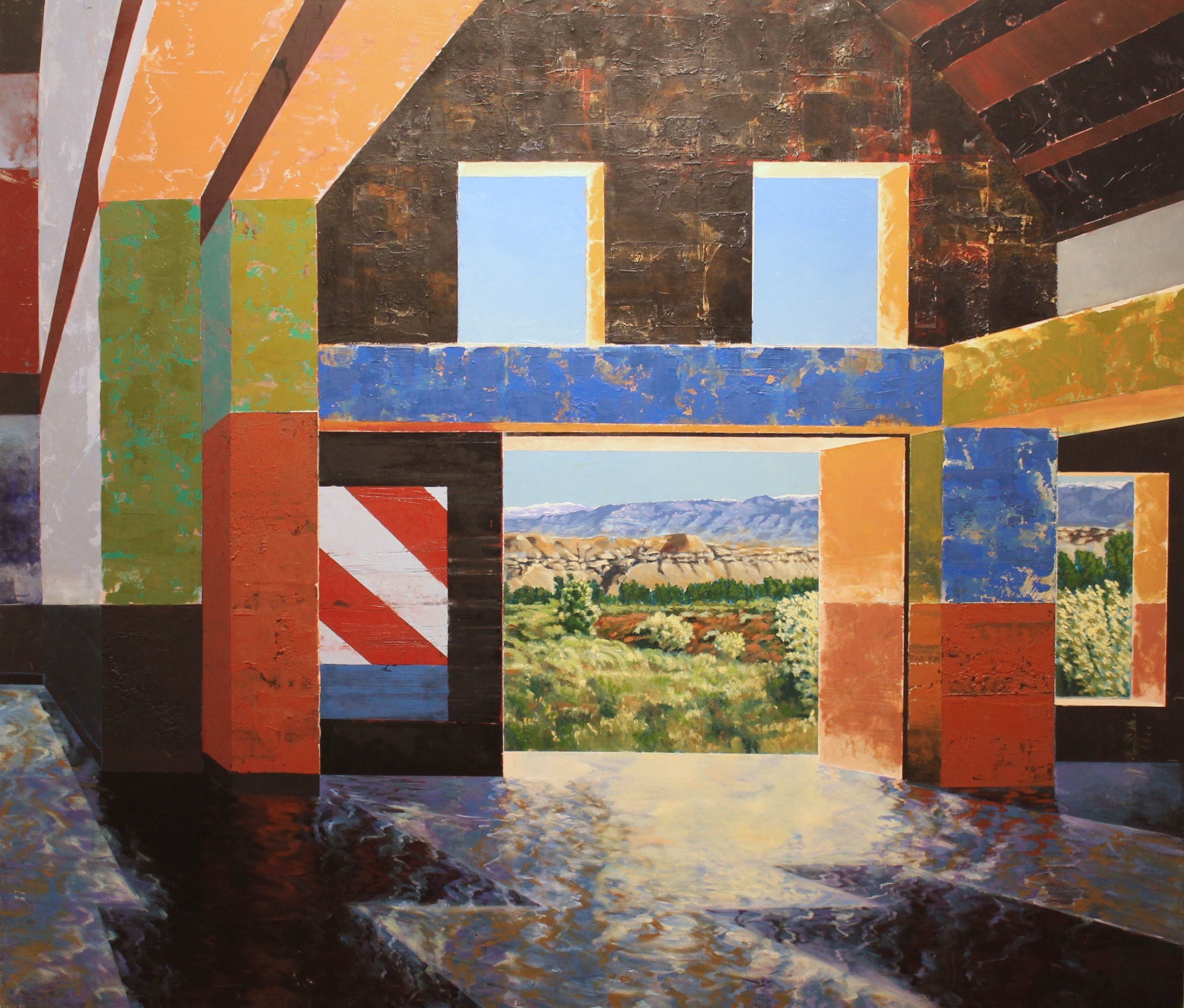 Clayton's new paintings almost burst off the wall with an unbridled new energy, and yet this energy finds it's counterpoint in a contemplative, formal restraint. This restraint is based both on the underlying geometry in the work, and the artist's empathic concern for the landscape that lies, at risk, just beyond the doorways and windows of his invented constructions. Discussing his most recent body of paintings, Clayton says: I have recently been acting out certain illogical impulses, retaliating against the logic of previous work. Sometimes it takes the form of reaction against the logical (mathematical) systems I've based my composition on. (linear perspective, the golden mean, etc). Pushing against, wrestling with, I often find myself thrown outside the "ring, the "ring" being my conventional rectangular format. The manifestation being new constructed paintings in which the subject defines the format rather than the customary visa-versa. Even when I choose to adhere to the discipline of the conventional rectangle, which I just as often do, there are other logical inferences about my chosen subjects - colors, textures and forms associated with industrial architecture for instance. I've recently found these associations just too restrictive and so there are, in these paintings, wild improvisations and displacements of color and texture. Well, wild for me anyway. Things have also changed in my views of the landscape. While previously I was concerned about documenting real locations objectively and then painting them back to nature, these new views are extrapolations, hybrids, and constructs. I am allowing myself to blatantly reinvent a nature that may be "super", or at least "extra-natural." The personal fictions present in the works of Ronald Clayton are both inspiring and challenging. Dualities are at play throughout the work: depth of space and articulated surface, the geometric and the organic, culture and nature, the familiar and the new. Clayton's two lynchpins are the biographical narrative of our experience with particular landscapes, and the imagined architectural ruins he places within them. In turn, we the viewers are placed in these ruins. We find ourselves admiring the work of the hands that created these mysterious structures, all the while longing to experience the untouched vision of nature just beyond our grasp. What a powerful metaphoric image of our ongoing search for a place in this world. |