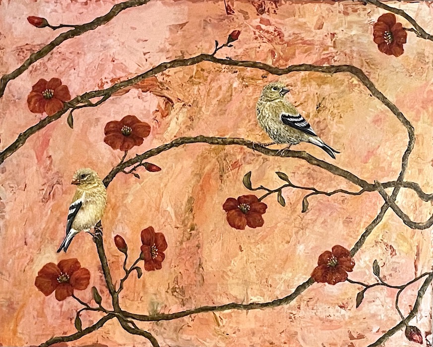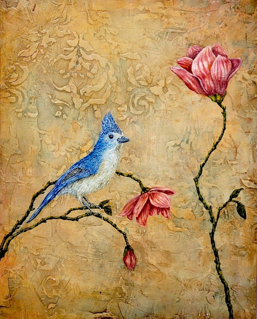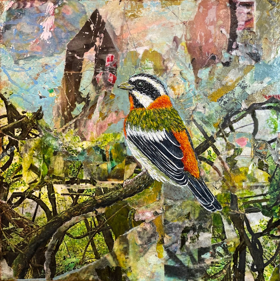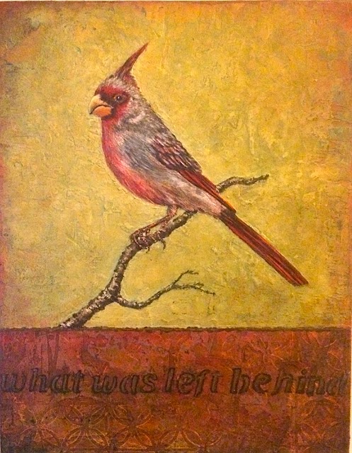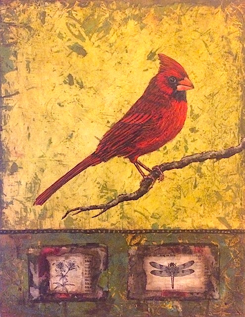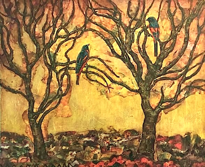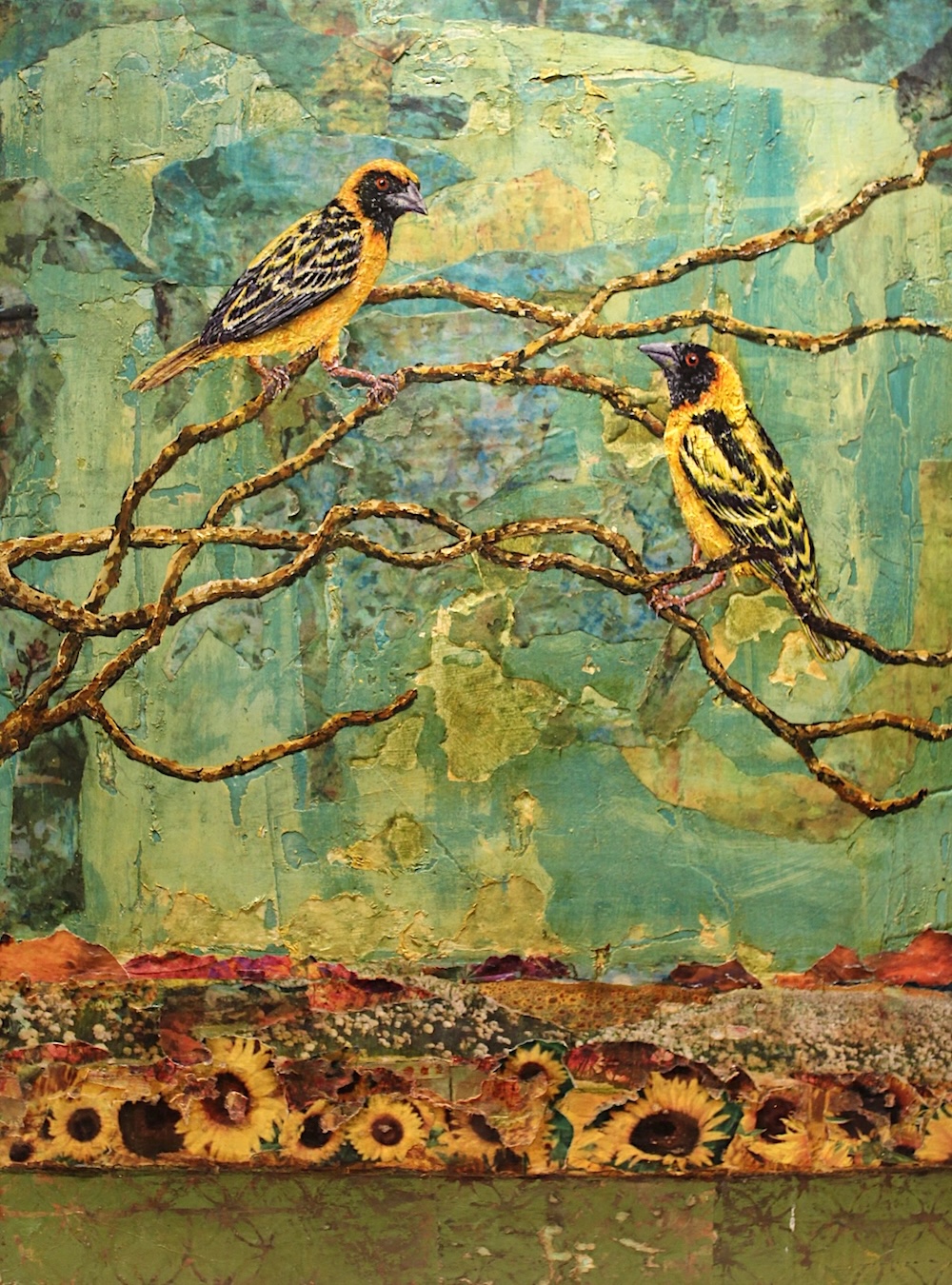 There is a rough, gritty strength found in the mixed media surfaces of Sandra Dawson's work that belies the gentle imagery of children, trees, sky, and birds. The imagery might reveal her love of nature, but it is the workman-like physicality of her paintings that carry her unique voice. Layering spackling compound, various paints, vigorous drawing, and and layers of collage, Dawson builds her paintings from the ground up. She renders her birds with a direct, detailed authority, poised on branches they have momentarily claimed. The viewer finds themself held in this moment, not only by the image of the bird, but by the palpable matrix of the sky and branch patterns where it rests. Says Dawson, "My work evolves from an observation of our natural world, our social circles and our internal psyche. In my work I weave images from past cultures, myths and folklore along with symbolic elements of modern life. I paint intuitively and playfully employing various mediums along the way. I consider my work an observation, meditation and celebration of life."