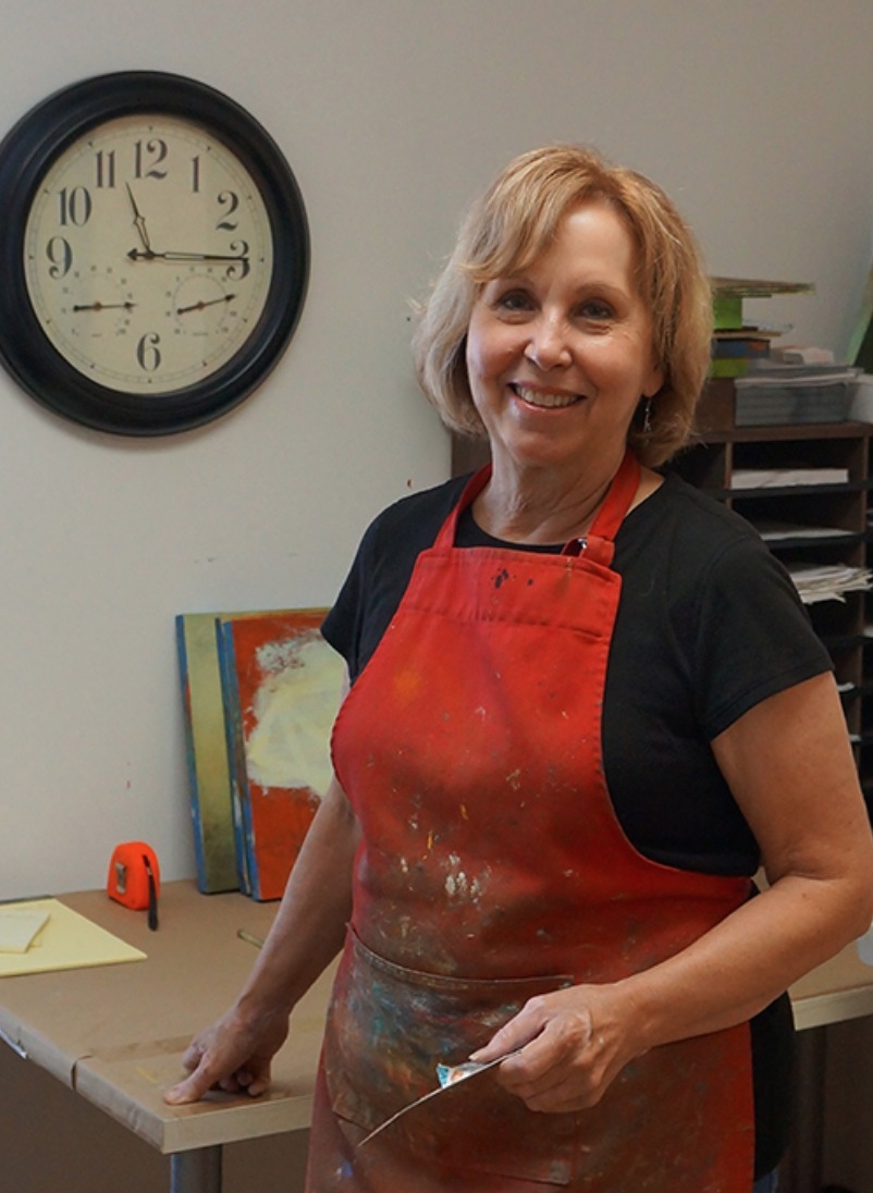 Joan works mainly in oil and cold wax, a medium that allows for the buildup of a rich history and